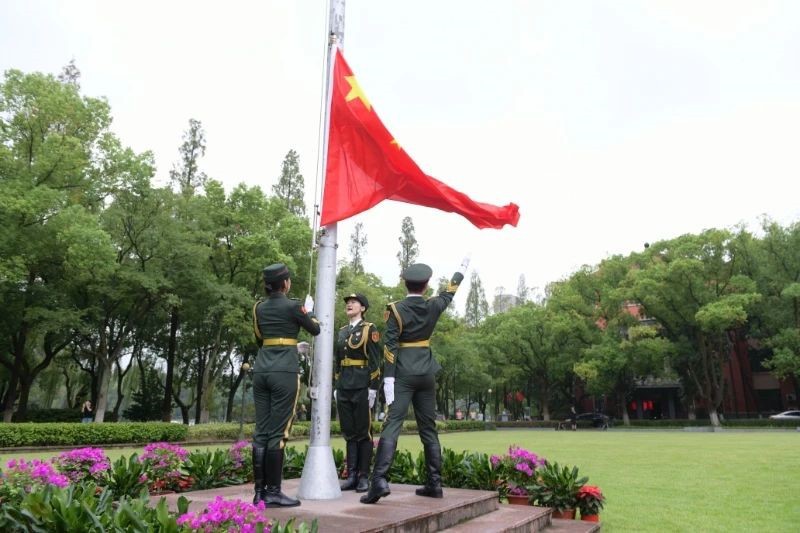 华家池校区,升旗仪式在奔马广场庄重举行。医学院师生,心怀家国,志在四方,用青春誓言告白祖国情深意长。